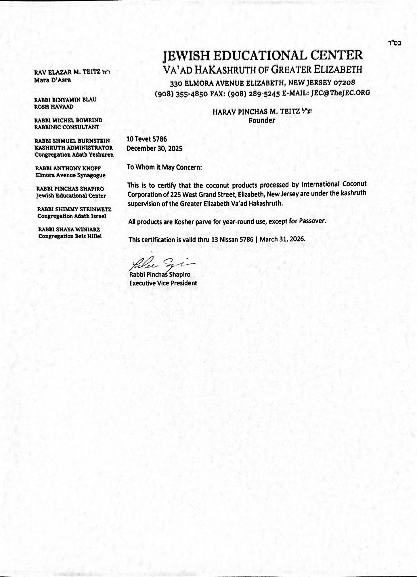 2025 INTERNATIONAL COCONUT CORPORATION - 225 WEST GRAND STREET (PO BOX 3326), ELIZABETH, NEW JERSEY 07207-3326 - (908) 289-1555 (908) 289-1556FAX