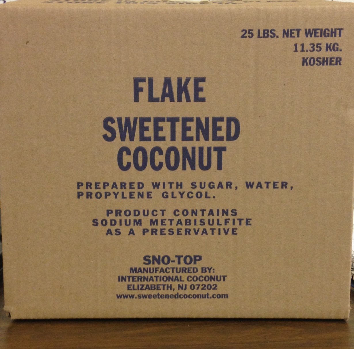 Sweetened coconut comes in different cuts/sizes. The most popular is flake coconut. This product is packaged into 10, 25, and 50 pound boxes. We can private label your box upon request.